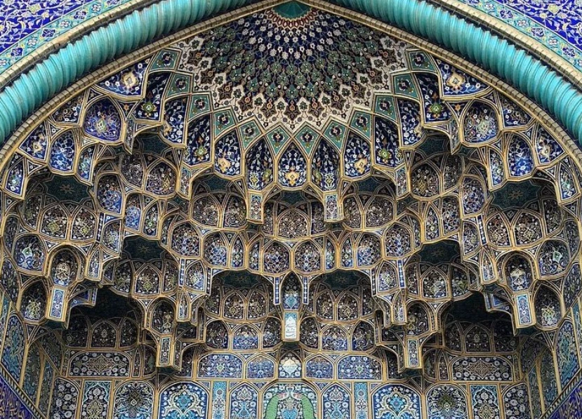 1364년 완성된 모스크의 동쪽입구로 가까이 다가가면 거대한 피쉬타크(Pishtaq, 건물의 입구로 기능하는 반으로 잘린 벌트 구조)의 표면을 덮고 있는 수많은 패턴들이 시각적 과부하를 불러일으킨다. 특히 이슬람식 벌트(vault) 구조인 무카르나스(muqarnas)의 현란함은 모니터를 통해 보고있음에도 불구하고 현기증을 유발한다. 그 아래서 고개를 꺾고 바라보는 사람들에게는 이것이 종교적 황홀경으로 작용할 것이다.