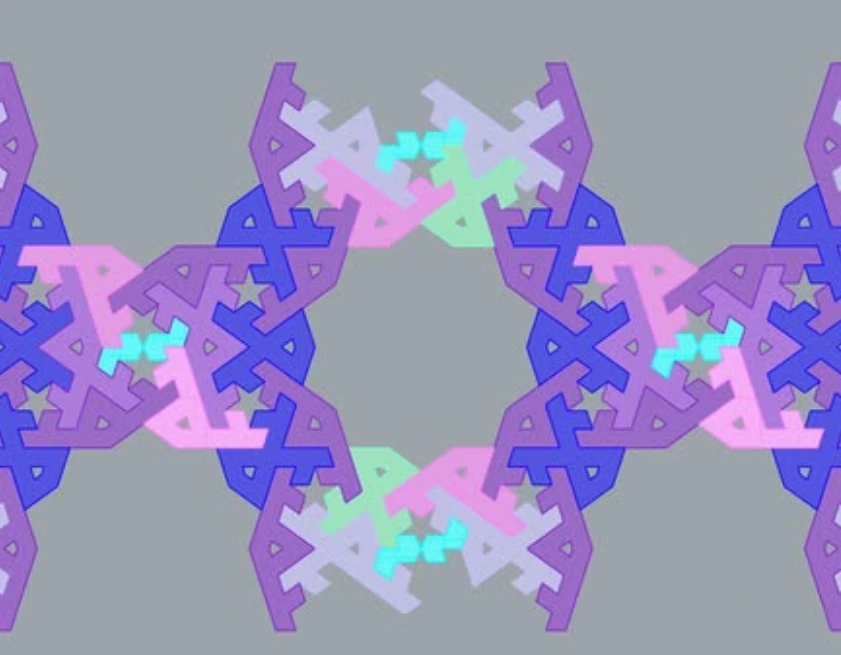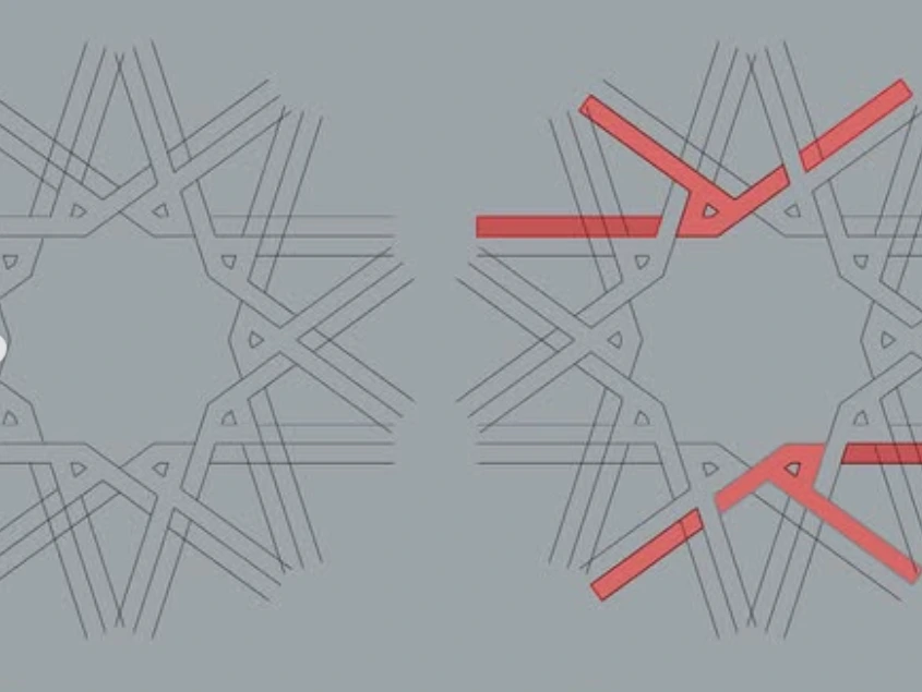 문양의 조형원리를 분석해보면 오각형을 36도 회전시켜 만들어진 10각성을 중심으로, 10각형 주변에 10개의 5각성이 생겨난다. 흥미로운 것은 가장 간단하게 두가지 형태의 반복으로 10각성 주변을 완벽하게 타일링 할 수 있음에도 불구하고 의도적으로 비대칭 적인 모티프를 만들어 놓았다는 것이다(아래 그림. 빨간 타일) 그 덕에 자칫 단조로워 보일 수 있는 완벽한 방사형 대칭구조에는 균열이 일어나고 패턴은 시각적으로 보다 흥미롭게 느껴진다