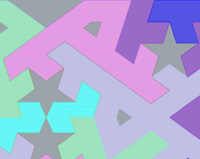 이 외에도 이 디자인에는 다른 비효율들이 존재한다. 먼저 가능한 최소 종류의 타일을 사용하여 평면을 채워야한다는 테셀레이션의 숭고한 원칙을 일부러 무시하듯 10각성을 제외하고도 9종의 모티프 들이 사용되었다(왼쪽 그림). 그렇게 만들어진 테셀레이션 조차도 완벽하지 않아 서로 마주보고 붙어있는 한쌍의 오각성은 다른 오각성에 비해 한쪽 뿔이 짜부러져야 겨우 빈틈없이 쪽매맞춤을 끝낼 수 있다(아래 오른쪽 그림). 오직 신만이 완전하여 일부러 불완전함을 넣었다는 억지스러운 설명보다는 원칙과 전통에 교조적으로 얽매이지 않았던 디자이너의 선택이었다고 생각한다.