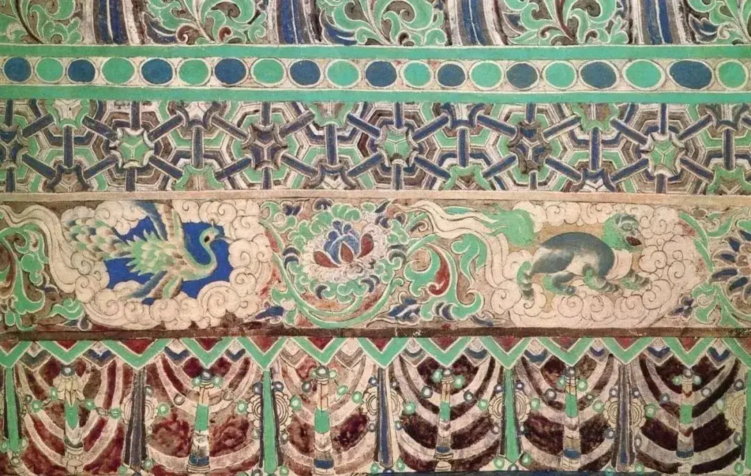 반룡의 둘레에는 예각으로 이루어진 다층의 첩훈(叠晕, 층층히 겹쳐서 번지는 그라데이션) 무늬가 둘러져 있어 강한 동세를 형성한다. 이 무늬는 영조법식에는 보이지 않으나, 지난 글 영락궁 조정 천장화에서 살펴본 ‘망목문(网目纹)’과 유사하며, 거란족이 세운 요나라 채화에도 비슷한 도안이 관찰되는 것으로 보아 당시 북방 소수민족 사회에서 유행하던 문양으로 추정된다.
