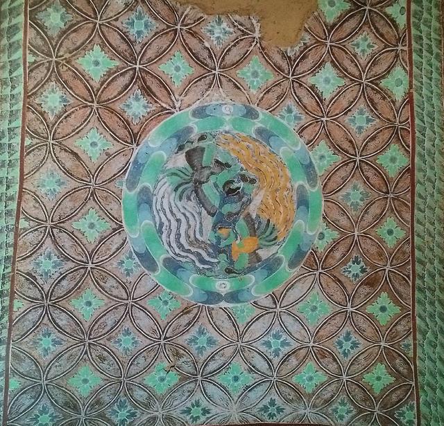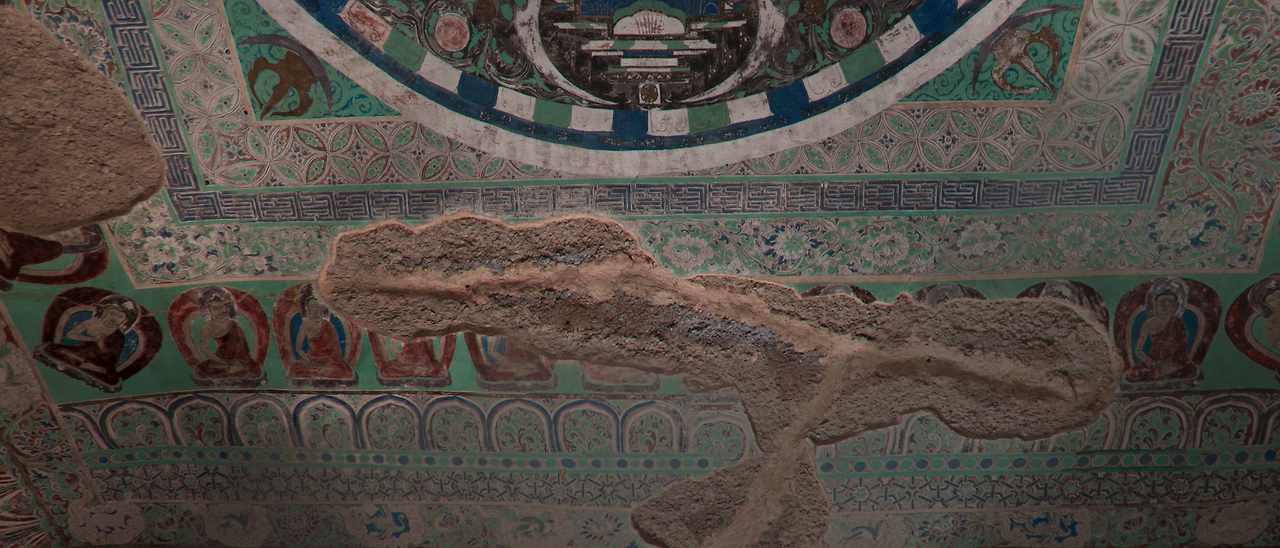 지난 글에서 언급한 조정(藻井, 천장 중앙에 깊게 들어간 장식 구조)과 벽화 가장자리의 장식 띠에는 영조법식과 매우 유사한 송대식 기하·연속 문양이 남북조 이래 유행하던 연주문(聯珠紋, 구슬을 꿰어 연결한 듯한 원환형 연속 문양) 및 티베트 불교 장식 문양과 결합된 형태로 나타난다. 기본적인 구성 원리는 네 개의 경사면 위에 수평 방향으로 10여 겹의 띠 장식을 연속 배치하여 층위감과 깊이감을 강화하고, 정중앙에는 회전감을 지닌 반룡(盘龙, 또아리 튼 용) 문양을 배치하여 ‘중심’과 ‘상승’의 시각적 인상을 강조하였다. 천정 전체의 주된 색조는 적갈색, 녹색, 백색이 중심을 이루며, 청색과 적색의 사용은 상대적으로 적은데, 이는 서하 민족이 녹색을 선호한 점과 적색을 내는 주사(朱砂) 안료의 수급이 부족했던 사정과 관련이 있을 것으로 추측된다.