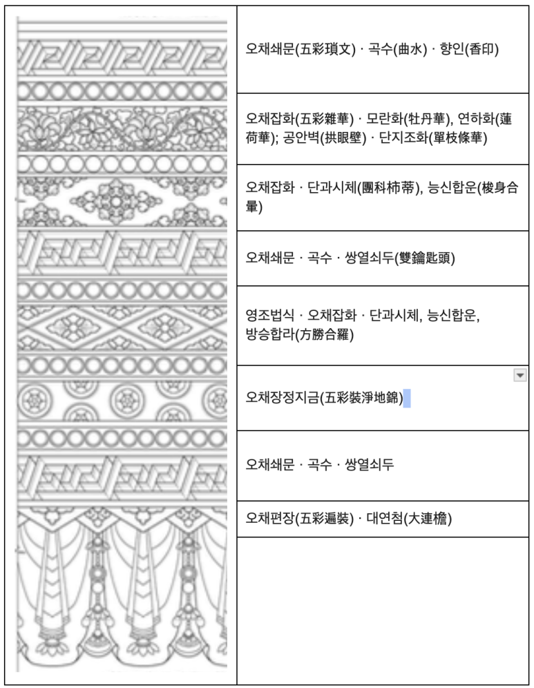 다수의 연구는 그 제도적 출발점을 북송(北宋) 시기인 1103년, 이계(李誡, Li Jie)가 편찬한 관영 건축서 《영조법식(營造法式)》에서 찾는다. 이 책에는 채화의 도식과 색채 규범, 부재별 장식 배치 원칙이 체계적으로 정리되어 있으며, 그중 ‘쇄문(鎖紋)’이라 불리는 기하학적 문양군이 처음으로 명시적인 용어와 도식과 함께 등장한다. 물론 송대(宋代) 이전에도 직물, 금속공예, 벽화 등 다양한 매체에서 반복과 대칭에 기반한 기하 문양이 널리 사용되었으나, 그것이 목조건축의 구조 부재 위에 일정한 규칙과 위계에 따라 적용되는 ‘건축 장식의 문법’으로 제도화된 것은 영조법식을 통해서였다.