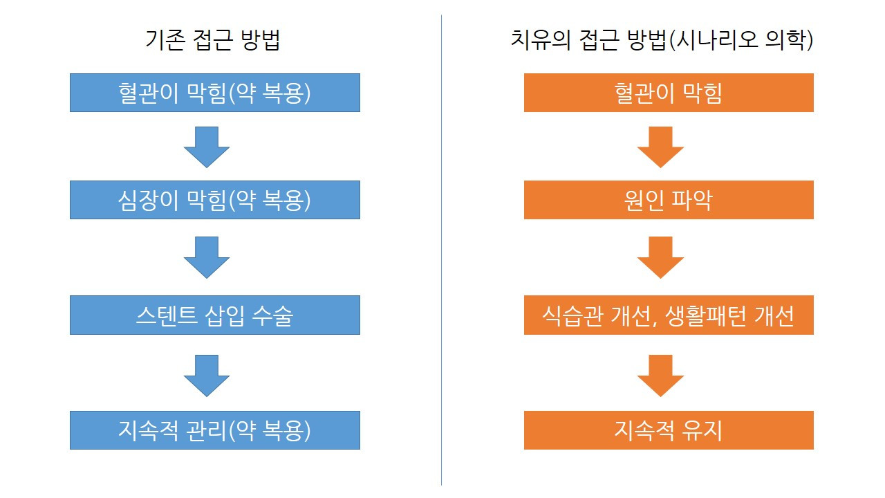 그런 접근보다는 심혈관 질환의 근본 원인을 찾고, 그 원인을 제거하는 형태의 치유(재생)가 필요하다고 생각한다. 의사 선생님은 나에게 그걸 '시나리오 의학'이라고 소개해주셨다.