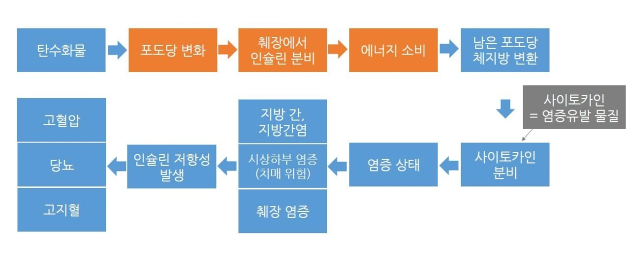 그러나, 다른 관점에서 탄수화물(밥)에 대해서 이야기해보면, 탄수화물에는 녹말, 글리코겐, 셀룰로오스 등의 당(sugar)을 만들어 준다. 탄수화물의 당 중에 포도당은 인체에서 중요한 역할을 한다. (의학, 생물학 등의 시간이 아니니 단당류, 다당류 등의 설명은 생략) 포도당이 분해되면서 에너지를 만들어 준다. 탄수화물을 많이 먹게 되면 체내 포도당의 농도가 급상승하게 되고, 혈당 수치를 낮추기 위해서 췌장에서 인슐린이 분비된다. 인슐린은 혈중 포도당을 세포 속에 흡수시켜 에너지원으로 저장하는 역할을 하는 호르몬이다. 그러나 인슐린과 만나지 못한 남은 포도당은 체지방으로 변환하게 되고, 체지방은 비만과 당뇨, 고혈압으로 이어진다. 이해하기 쉽게 아래의 이미지 참고.