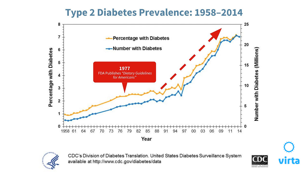 그러나, 권장식단 발표 이후, (탄수화물을 줄여야 하는 이유를 읽은 우리가 예상한 것처럼) 심혈관질환은 급증하고 있다. 다양한 외부 변수 영향도 있겠지만, 이 권장식단은 심혈관질환 개선에 유의미한 도움이 되지 않았다고 유추할 수 있다. 아래 차트를 보면 1977년 이후 당뇨가 지속적으로 증가하는 것을 알 수 있다.
