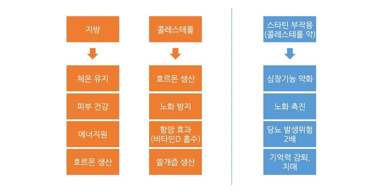 이런 콜레스테롤은 세포막을 구성하는 성분으로 장기의 기능을 정상적으로 유지하는 역할, 소화를 돕는 담즙 생성 원료, 여성호르몬, 남성호르몬 및 부신 호르몬(스트레스를 대항하는 호르몬)의 재료, 노화 방지, 항암효과(지용성 비타민D를 흡수시켜서 대장 직장암 예방 효과)의 기능을 가지고 있다. (또한 콜레스테롤을 낮춰준다는 스타틴의 부작용을 알아보면 스타틴을 부모님께 드시라고 권해드릴 약이 아니다.) 그리고, 콜레스테롤이 낮으면 발생하는 또 다른 질병(백혈병, 영양실조, 고형암-간, 대장, 유방-, 우울증 등)을 조심하기 위해서 적정량의 지방을 반드시 먹어야 한다. 이런 콜레스테롤 기능과 역할을 통하여 우리 몸은 피부가 좋아지고, 젊어지며, 건강해지고, 활기찬 생활을 할 수 있게 해 준다.