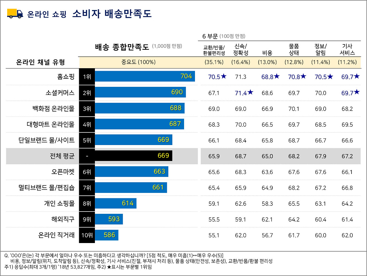 온라인 채널 유형 중 홈쇼핑의 배송 종합만족도가 높은 것을 자료를 통해 확인할 수 있습니다.