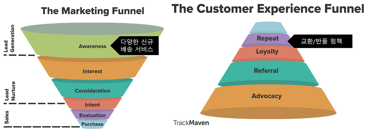신규 배송 서비스를 통해 인입된 고객은 고객 경험 퍼널의 단계에서 해당 온라인 채널을 반복적으로 이용할 것이냐 아니냐를 결정하는 데 있어 '교환, 반품'정책의 깊이를 본다는 것을 반증하기도 합니다.