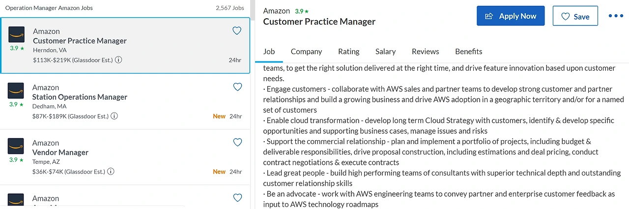 이에 글라스 도어 (한국의 잡플래닛과 같은 사이트)에 들어가 customer service라는 키워드부터 입력하기 시작했다. 그리고 어렵지 않게 연관 단어로 operation이라는 단어가 연동되어 등장했고 핵심 단어로 customer experience라는 (CX) 것도 심심치 않게 발견할 수 있었다.