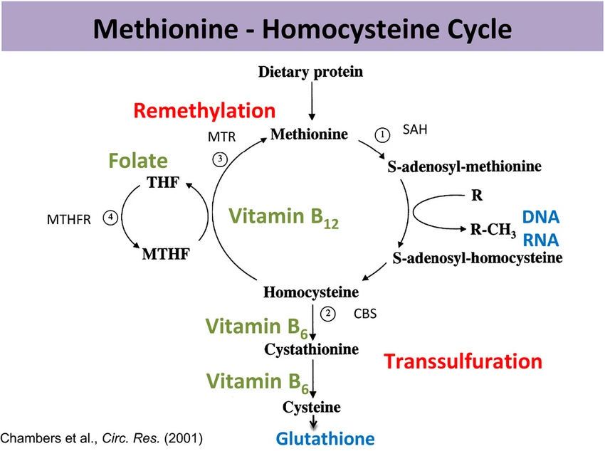 위의 그림을 보면 알 수 있듯이 단백질이 대사하는 과정에서 비타민B6, 비타민B12, 엽산이 있어야 원활한 대사가 이루어질 수 있고, 그래야 호모시스테인이 메티오닌과 시스테인으로 전환되어 호모시스테인 농도를 낮출 수 있다.