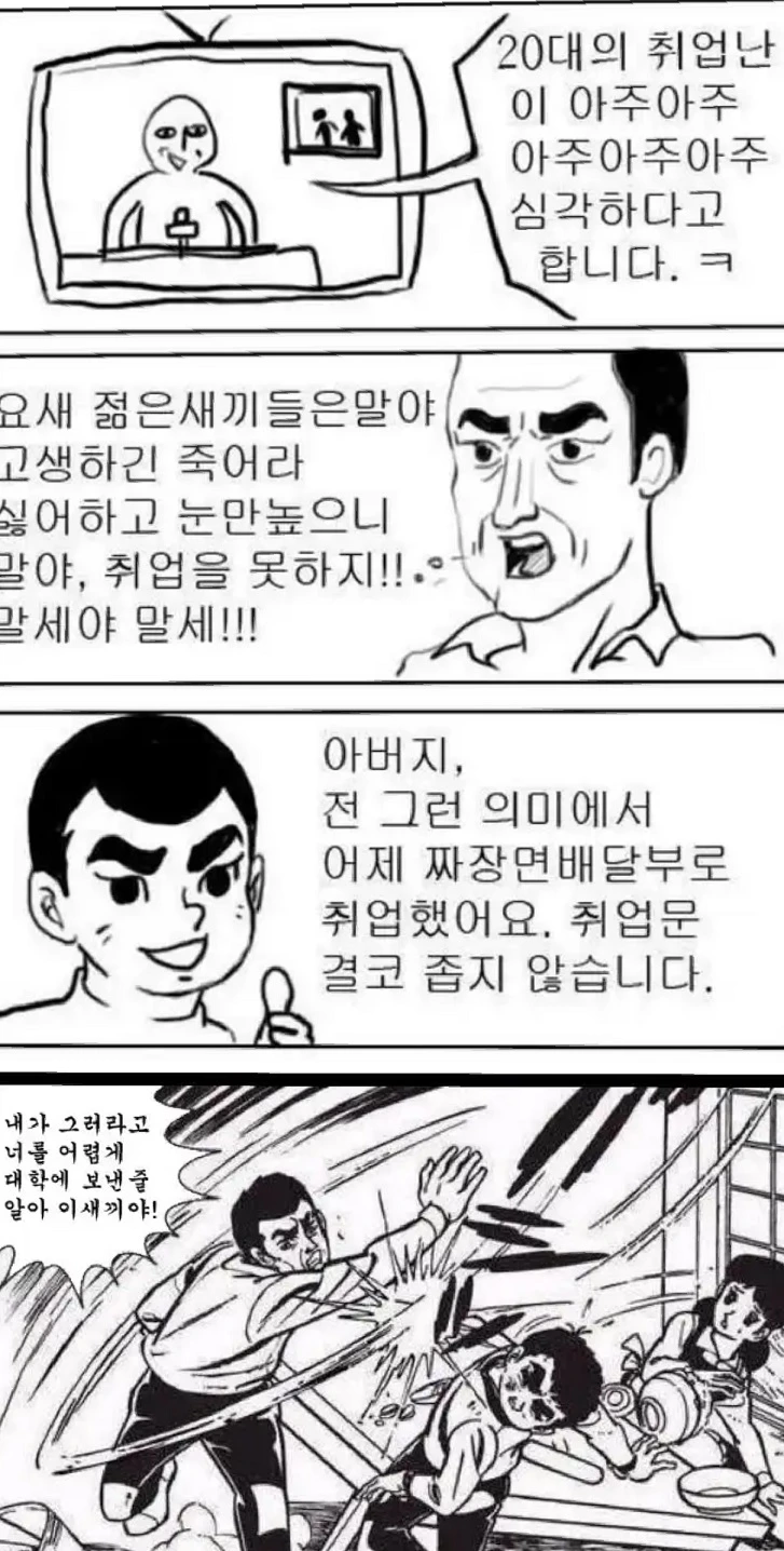 제가 예전 글들에서 했던 이야기랑 통하는 이야기입니다만, 지금 젊은 세대는 생존의 문제가 충분히 해결된 이후의 대한민국에서 태어나 대다수의 경우 생존에 필요한 의식주 정도는 충분히 공급받으면서 "넌 공부만 열심히 해!" 같은 소릴 들으며 자랐습니다. 부모세대는 '나는 먹고살기 바쁘고 학교 다닐 돈이 없어서 못 배우는 바람에 이렇게 힘든 일 하고 살지만, 내 자식은 잘 먹고 잘 입을 뿐만 아니라 심지어 학교도 다니고 학원도 다니니까 당연히 명문대 나와서 전문직이나 대기업 사원 정도는 충분히 할게 틀림없다'라고 생각했을 겁니다. 이런 사고에 당연한 전제로서 깔려있는 생각은 직업에는 귀천 내지는 높낮이가 있고, 낮은 직업은 가난하고 높은 직업은 부유하다는 것입니다.