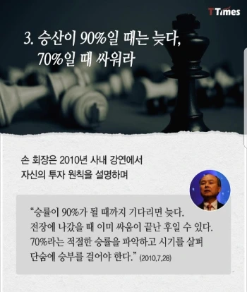 대응하기 위해 승산이 90%일 때 뛰어드는 것은 너무 늦다는 그의 투자철학은 어찌보면 매우 합리적으로 보인다.