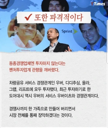 2015년 적자에 허덕이던 쿠팡에 1조를 과감히 투자한 그의 투자방식을 보듯 그의 투자방식은 평범한 사람이 쉽게 상상할 수 없는 과감함을 보인다.
