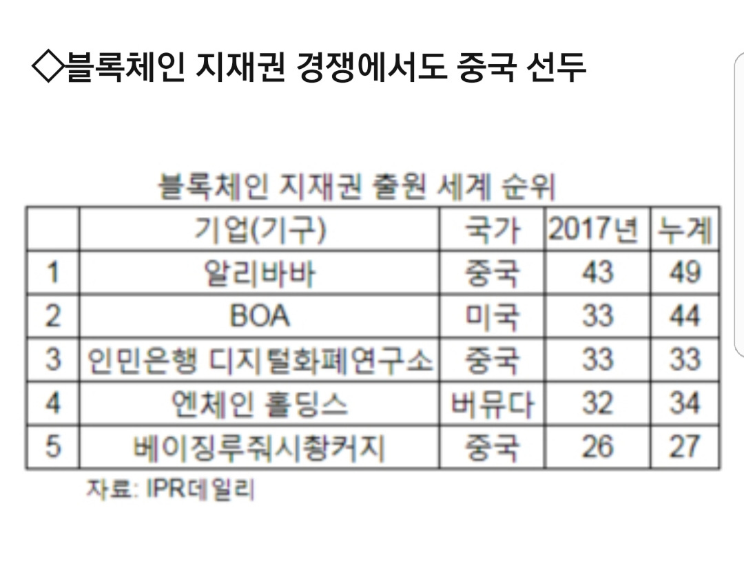 블록체인 지적재산권 출원 세계 순위의 3위에 중국 인민은행이 자리한다는 점,