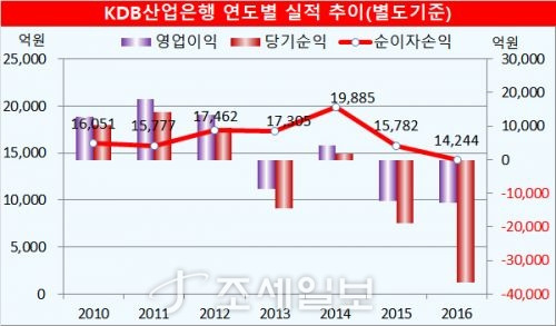 산은은 1997년 외환 위기 이후 부실 기업 정리의 선봉에 나섰지만, 부실 기업에 세금을 쏟아부어 산소호흡기로 연명시키는 데 급급해왔다. 실적은 나빠졌고, 덩치만 커졌다. 2015년과 2016년 각각 1조8951억원, 3조6411억원 순손실을 냈다. 임직원은 2012년 2640명에서 작년 말 3326명으로 26% 늘었다.