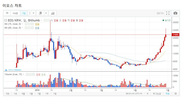 이오스는 암호화폐 시총순위 5위에 자리잡을 만큼 이미 대중적인 암호화폐 이지만 놀랍게도 아직 메인넷 론칭을 하지 않은 개발 단계의 플랫폼이다. 메인넷 론칭이 한달 즈음 남은 지금 아직 어떤 성과를 보여주지 못했음에도 최근 이오스의 가격 상승은 눈부셨다.