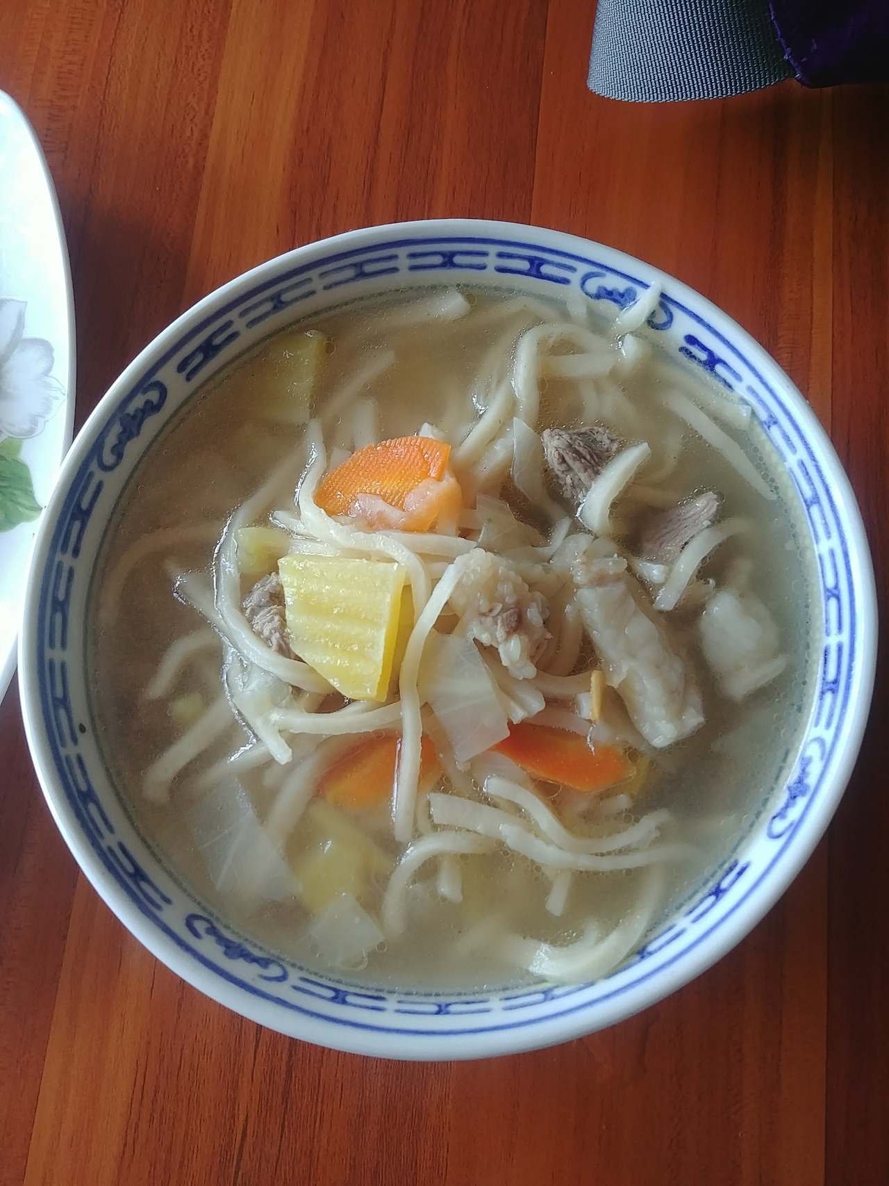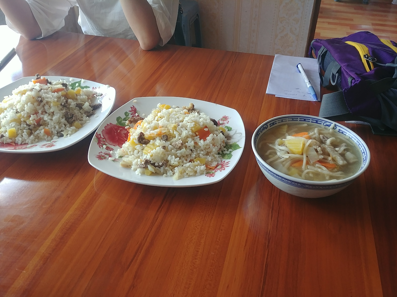 침게가 시켜준 국물요리. 음식이 나올 때까지 침게는 한글로 '신기루'를 반복해서 써보고 있었다. 점심 메뉴는 볶음밥이었는데 침게가 나를 위해 국수를 하나 시켜주었다. 침게는 한국어를 더 공부해야겠다는 것을 느낀다며 "그때 그게 뭐 라그랬지? 싱기..?"라고 물었고 언니가 "신기루!"라고 대답해주었다. 침게는 "그거 어떻게 쓰는 거지?" 라며 종이와 펜을 꺼내서 한글로 썼고 언니와 나는 그거 맞게 고쳐주었다. 침게는 음식이 나올 때까지 '신기루'를 반복해서 적었다. 음식이 나왔고 따뜻한 국물을 먹으니 좀 괜찮아지는 것 같았다. 사실 고깃기름으로 만든 국물이라 장에 좋은 편은 아니었겠지만 그냥 따뜻한 것이 들어가니 속이 편안해지는 느낌이 들어 멀미가 달아나는 것 같았다.