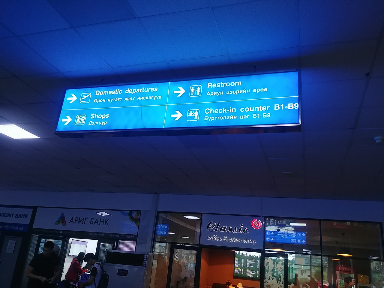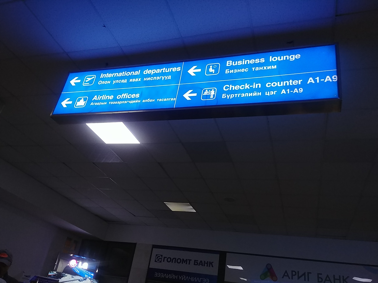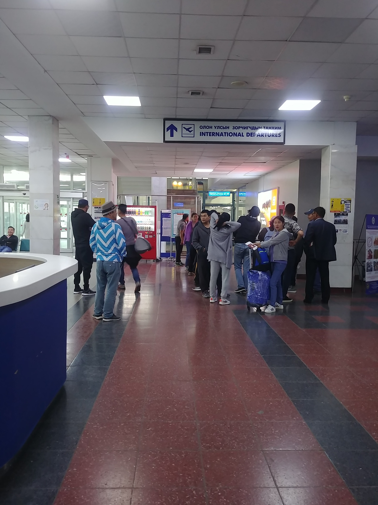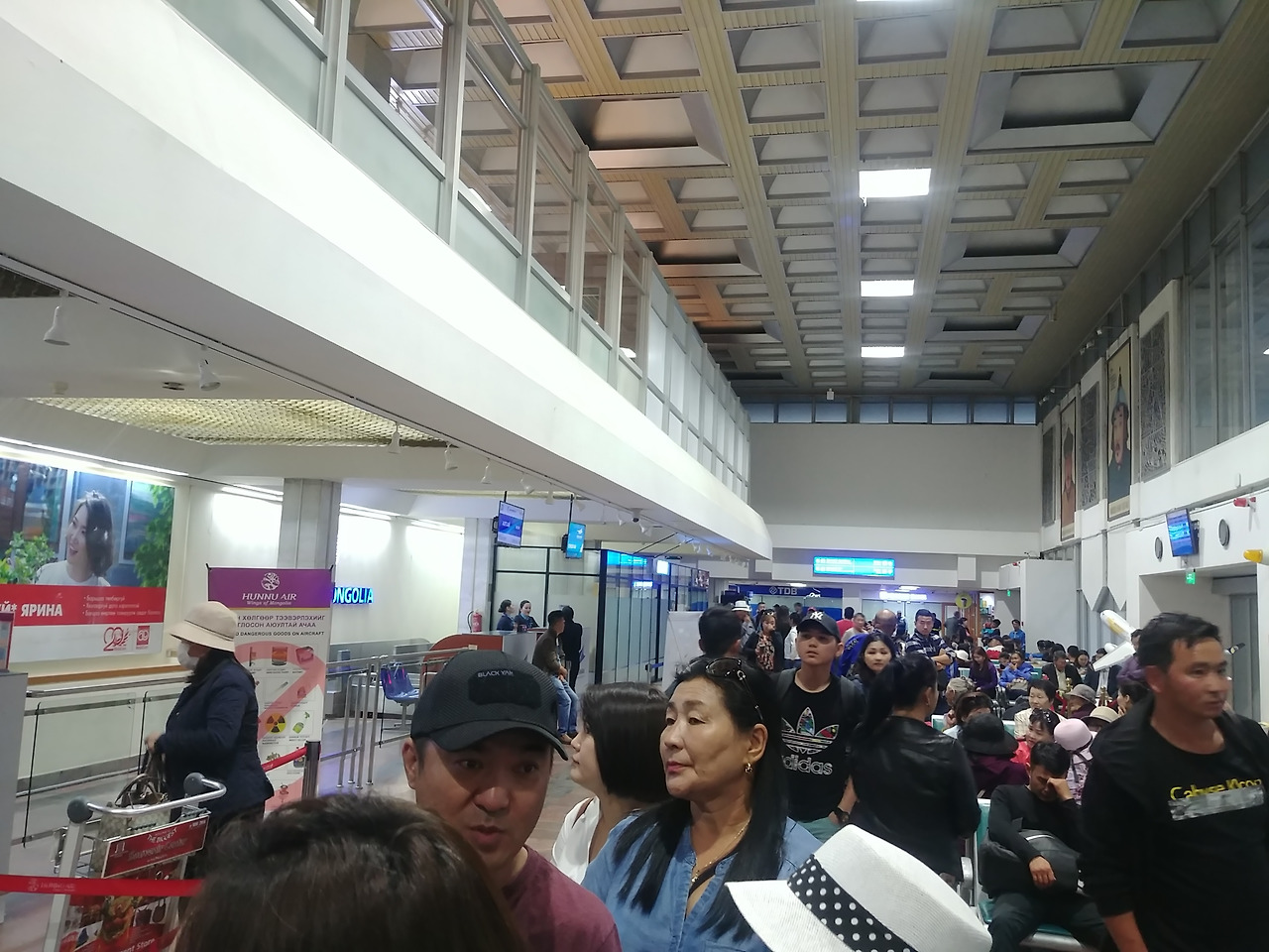사장님은 우리를 태우고 언니의 숙소로 향했다. 언니 숙소는 밤에 왔으면 조금 무서웠을법한 곳에 있었다. 사장님도 이런데가 있는지 몰랐다고 하며 언니가 무서웠다고 하자 무서울 법하다고 대답하며 웃었다. 공항에 도착했고 우리는 MIAT항공이라고 쓰여 있는 체크인 카운터 앞에 줄을 섰다. 앞에 서 있던 몽골 사람으로 추정되는 외국인들이 우리를 슬쩍슬쩍 쳐다보며 무슨 이야기를 하는 듯했다. 20분쯤 지나니 그 외국인들 중 한 명이 어디로 가냐고 물었다. 한국으로 간다고 하자 여기는 국내선이니 국제선으로 가라고 손가락으로 위치를 알려줬다.아무리 봐도 우리가 국내선을 탈 것 같지 않은데 서 있어서 계속 쳐다보다가 이야기해준 것 같았다. 그 외국인이 가리키는 쪽을 보니 international departure이라고 쓰여있는 곳이 있었다. 거기로 들어가려고 하자 아직 한국으로 가는 비행기는 체크인 카운터가 열리지 않아 들어갈 수 없으니 기다리라고 해서 기다릴 곳을 둘러보다 의자가 많이 있는 대합실 같은 곳이 있어 앉아서 기다리기로 했다.