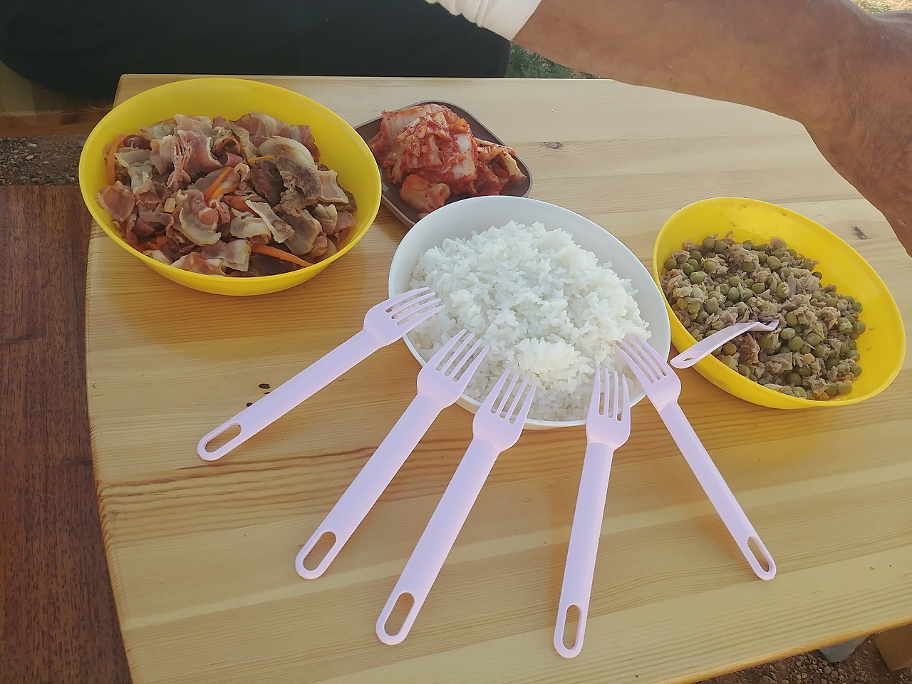 엘사가 아침을 먹으러 오라고 우리를 불렀다. 자꾸 파리가 꼬이니 빨리 오라고 했다. 아침을 먹으러 가니 헤라가 열심히 파리를 쫓고 있었다. 57살(56살인가)의 전직 유도선수 헤라는 자꾸만 귀엽다. 모두 다 자리에 앉아 아침을 먹는데 헤라가 엘사에게 뒤에 나방이 붙었다고 하자 엘사가 "으아아아~" 하며 헤라에게 빨리 떼 달라고 했다. 몽골사람들은 벌레 같은 건 별로 신경 안쓸 줄 알았는데 어젯밤에도 잠깐 느꼈지만 엘사는 우리보다 더 벌레를 싫어하는 것 같았다.
