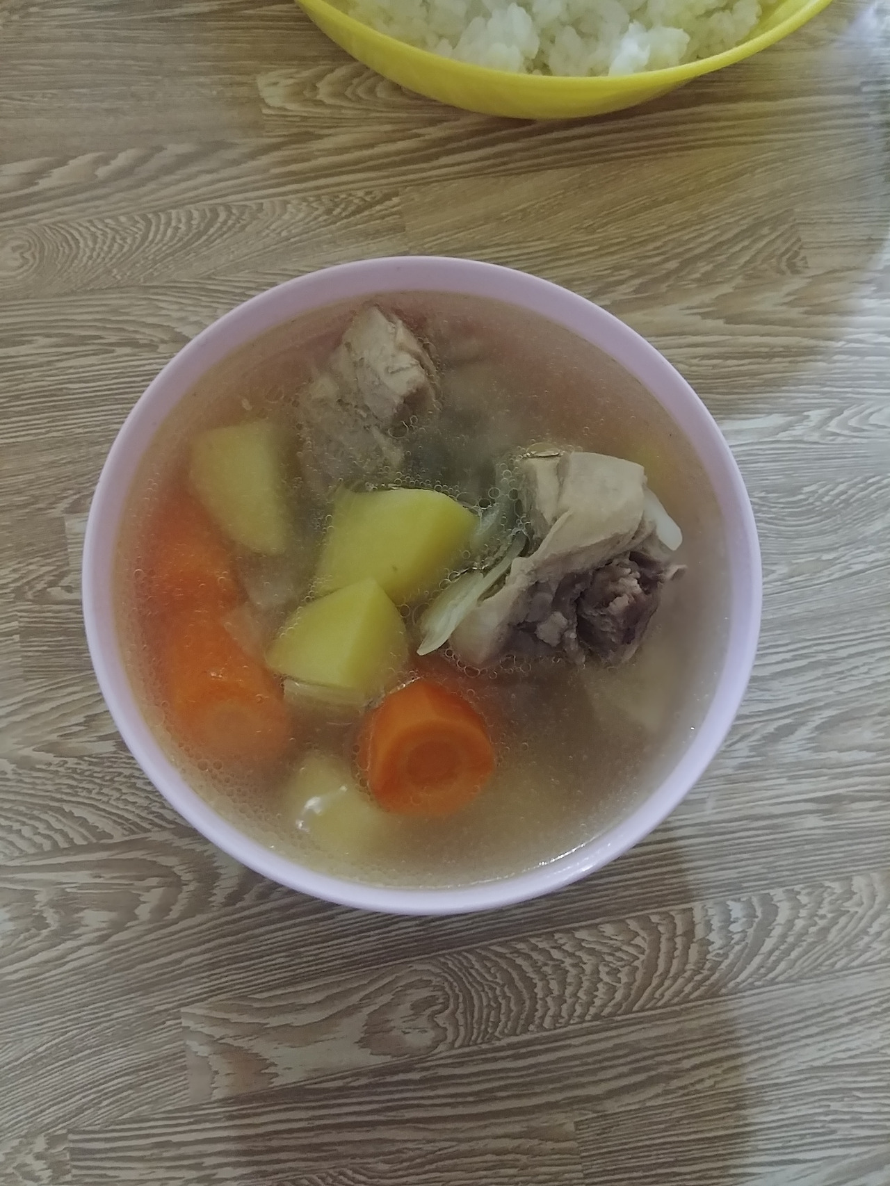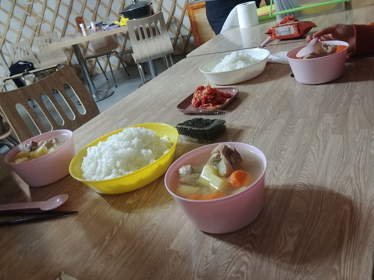 점심에 우리는 국물을 먹고 싶어서 침게에게 저녁에 라면 끓여주면 안 되냐고 물었었다. 침게는 매우 당황한 표정으로 "안돼. 라면 내일 먹어. 저녁 닭도리탕 할 거야."라고 이야기했었다. 닭볶음탕이면 괜찮겠다 싶었다. 라면처럼 빨간 국물일 거고, 국물도 있을 거고. 그런데 실제로 보니 닭볶음탕이라기보단 닭곰탕 같은 맑은 닭국이었다. 살짝 실망했지만 사막을 올라가는 게 너무 힘들었어서 그런지 기름기 있는 국물이 속을 뜨끈하게 채워주는 기분이 좋았다. 싸르르 아팠던 배도 달래주는 것 같고. 그리고 첫 국물요리라 그런지 밥을 말아먹고 싶은 생각이 간절해서 고기를 다 건져먹고 밥을 말았다. 침게가 국물 더 주냐고 해서 더 달라고 했는데 국물만 더 주는 게 아니라 고기까지 아예 한 그릇을 준다는 말이었다. 그래도 깨끗이 잘 비웠다. 한국에서는 국물에 염분이 많다고 해서 국물요리에서 건더기만 건져먹었던 터라 밥을 국에 말은 것이 몇 년 만인지 잘 기억이 나지 않았다. 국물요리가 이렇게 좋은 거구나.
