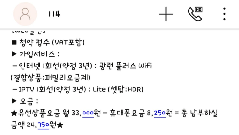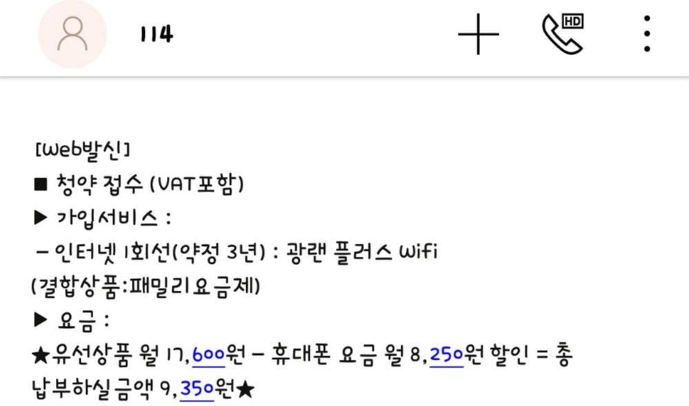 "네? 제가 분명히 인터넷 비용 17,600원에 휴대전화 할인 8,250원 들어간다고 안내받았고 그렇게 문자도 받았거든요."
