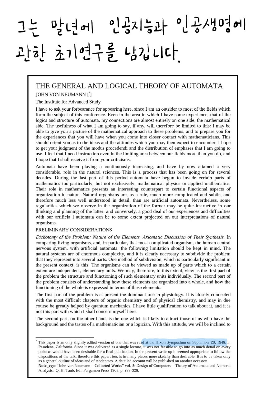 그는 말년에 인공지능과 인공생명에 관한 초기연구 < The General and Logical Theory of Automata >를 남깁니다.