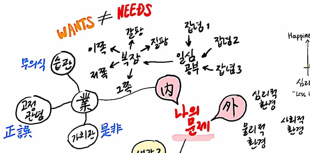 나의 內的(내적)으로는 業(업)이라는 이유로 생각하기가 쉽지않다. 業이란 고정관념, 습관, 가치관을 말하는데 이것은 오랜 시간동안 나도 모르게, 혹은 의도적으로 고착시킨 결과라서 쉽게 바꾸기 어렵다.