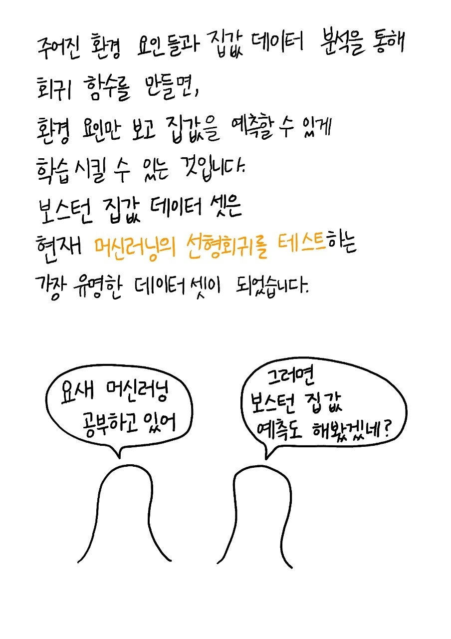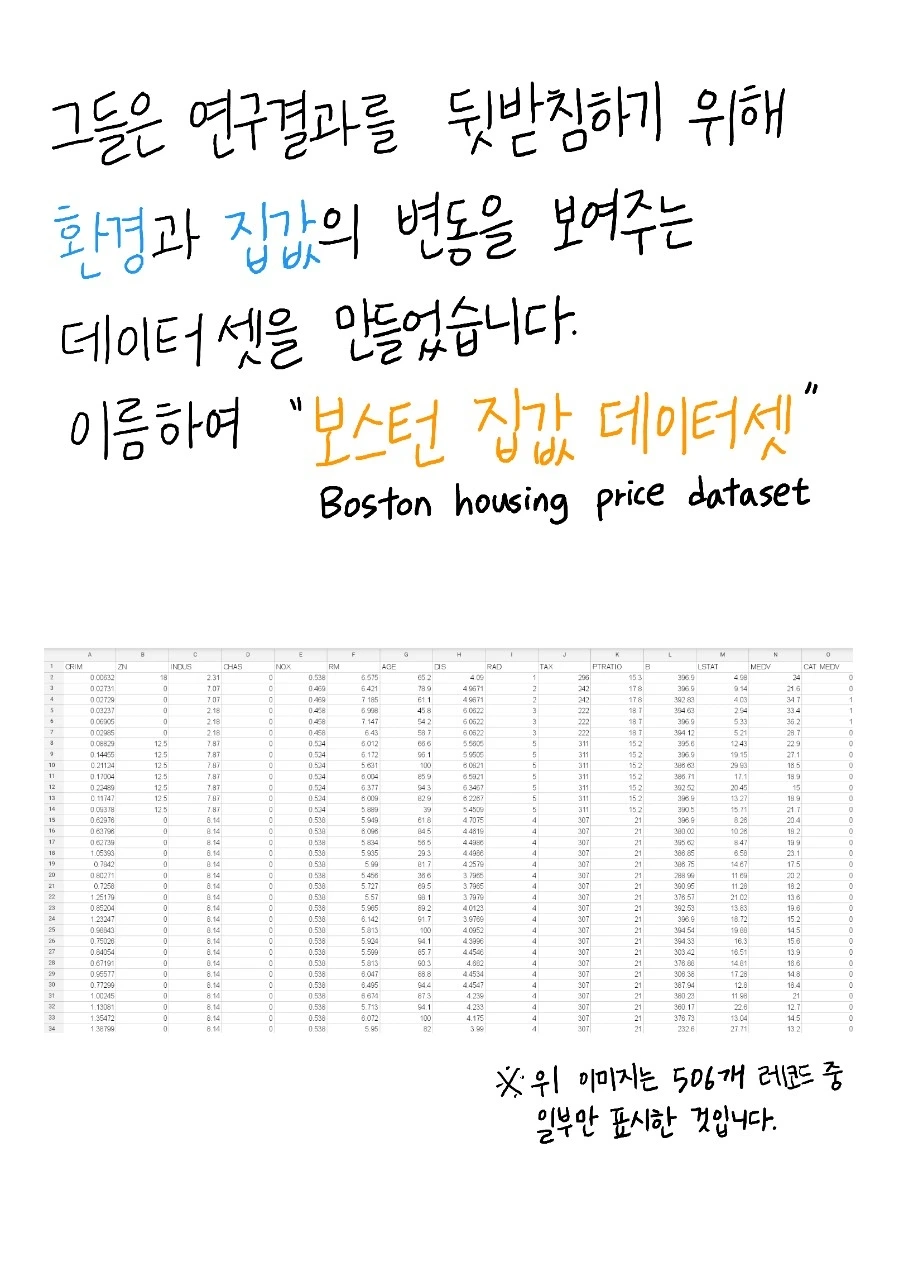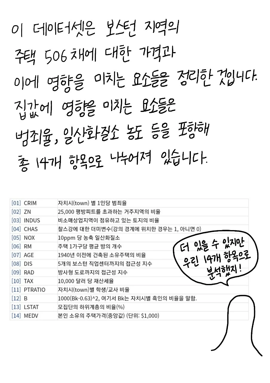 데이터명 : Boston Housing Price (보스턴 주택 가격 데이터) 레코드수 : 506 개 필드개수 : 14 개 데이터설명 : 보스턴 시의 주택 가격에 대한 데이터이다. 주택의 여러가진 요건들과 주택의 가격 정보가