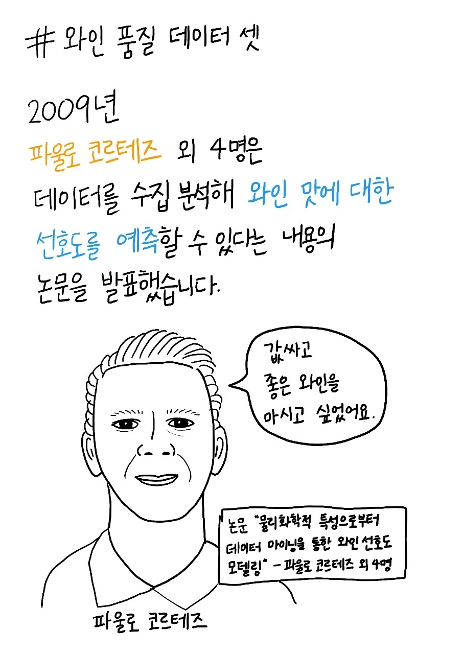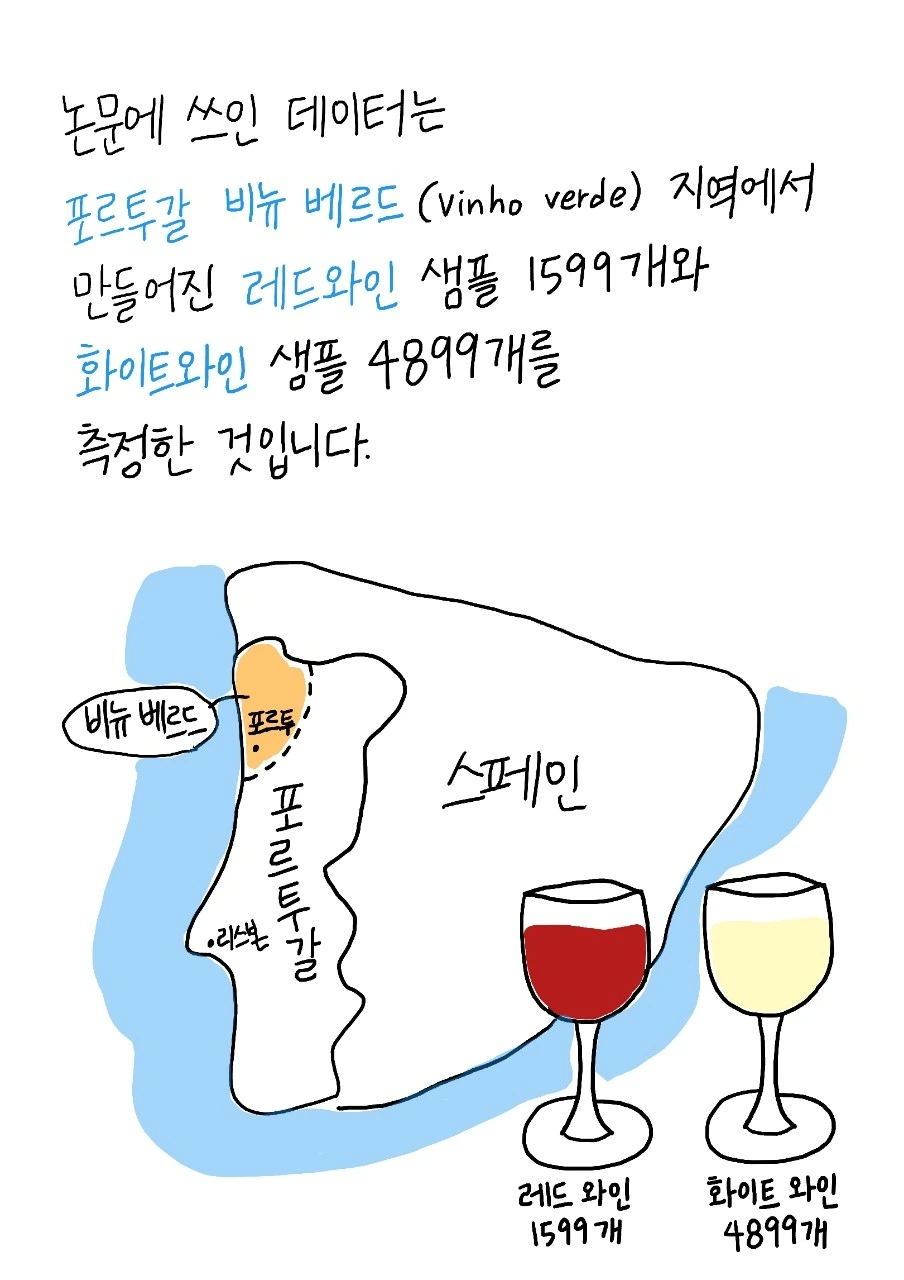 와인 측정 데이터 (Wine Quality Data Set) · 포르투갈(Portugal) 서북쪽의 대서양을 맞닿고 위치한 비뉴 베르드(Vinho Verde) 지방에서 만들어진 와인을 측정한 데이터입니다. · ..