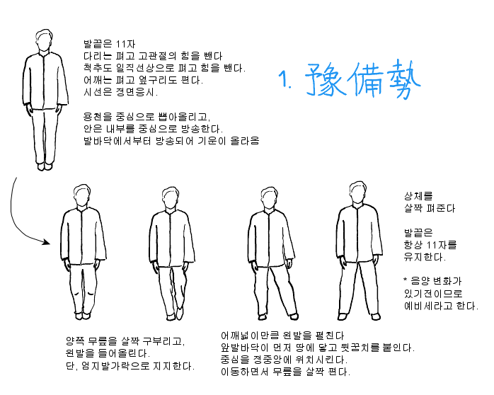 먼저 예비세입니다. 다른 분들은 모두 기세라는 표현을 쓰는데 반해서 진소왕 사부님께서는 예비세라고 부르는데 여기에 이미 진소왕 사부님의 태극권에 대한 관점이 드러나 있습니다.