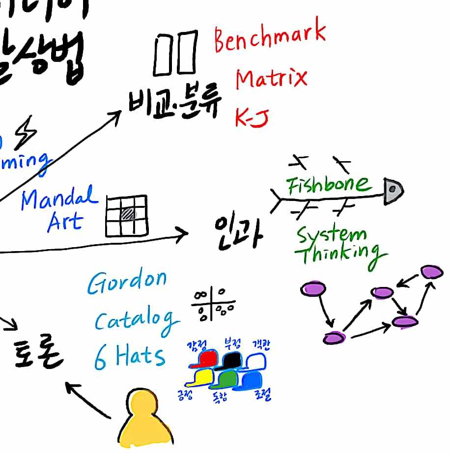 이상 아이디어를 도출하기 위한 몇가지 방법을 돌아보았다. 이 외에도 수많은 방법들이 있다. 이런 기법들이 유용하기 위해서는 방법론을 잘 아는 퍼실리테이터들이 필요하다. 중요한 것은 적재적소에 써먹을 수 있어야 한다는 점이다.