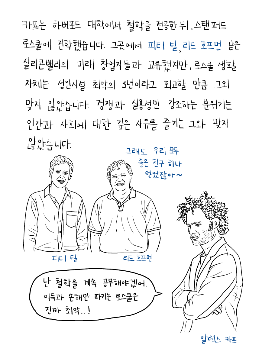 그곳에서 피터 틸 Peter Thiel, 리드 호프먼 Reid Hoffman 같은 실리콘밸리 Silicon Valley의 미래 창업자들과 교류했지만, 로스쿨 생활 자체는 성인시절 최악의 3년이라고 회고할 만큼 그와 맞지 않았습니다. 경쟁과 실용성만 강조하는 분위기는 인간과 사회에 대한 깊은 사유를 즐기는 그와 맞지 않았습니다.