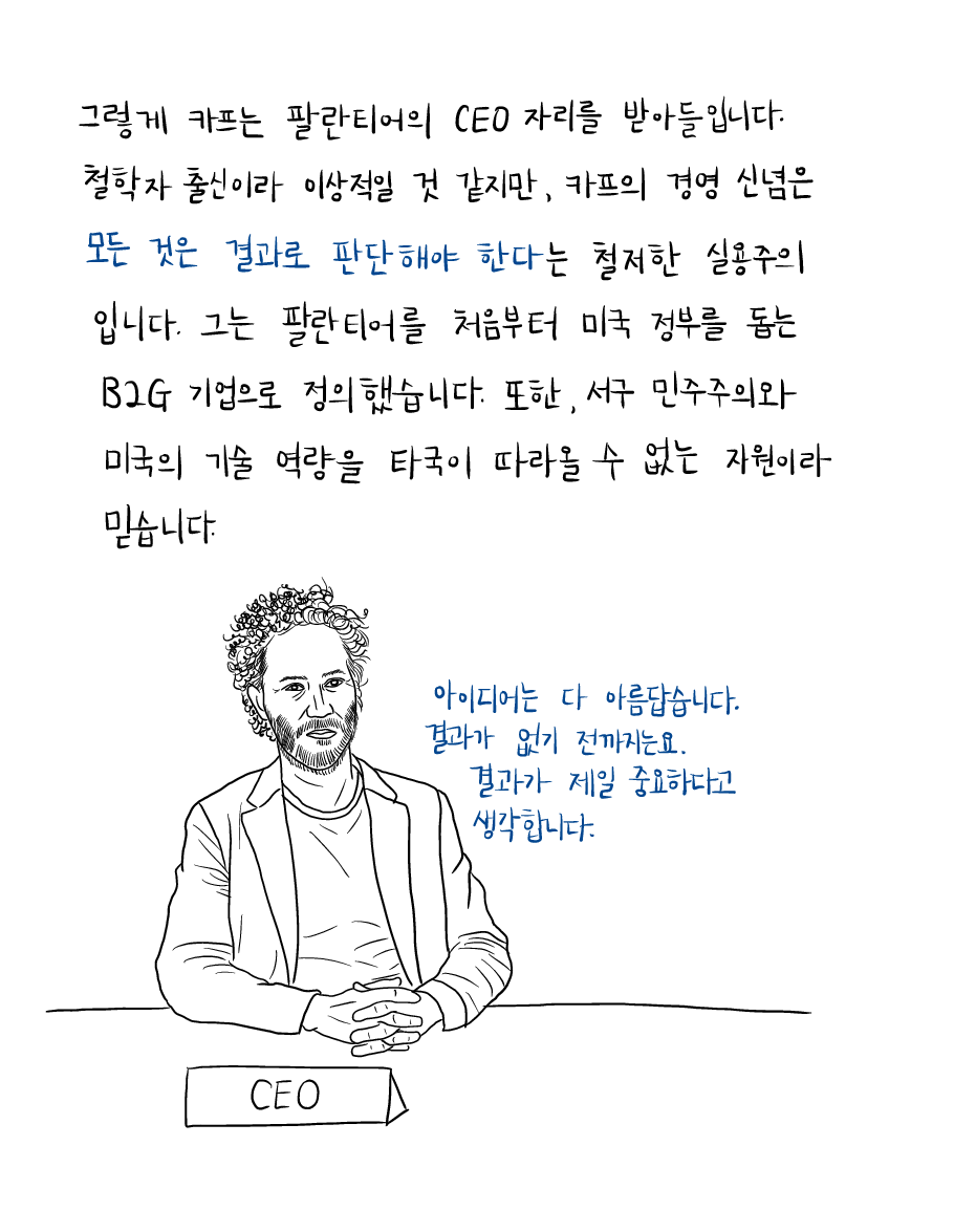철학자 출신이라 이상적일 것 같지만, 카프의 경영 신념은 모든 것은 결과로 판단해야 한다는 철저한 실용주의입니다. 그는 팔란티어를 처음부터 미국 정부를 돕는 B2G(Business to Government) 기업으로 정의했습니다. 또한, 서구 민주주의와 미국의 기술 역량을 타국이 따라올 수 없는 자원이라 믿습니다.