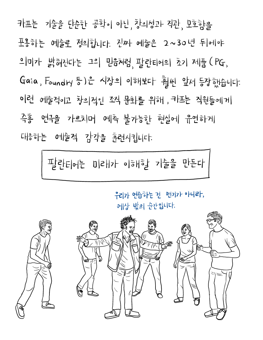 카프는 기술을 단순한 공학이 아닌, 창의성과 직관, 모호함을 포용하는 예술로 정의합니다. 진짜 예술은 2~30년 뒤에야 의미가 밝혀진다는 그의 믿음처럼, 팔란티어의 초기 제품(PG; Palantir Gotham, Gaia, Foundry 등)은 시장의 이해보다 훨씬 앞서 등장했습니다.