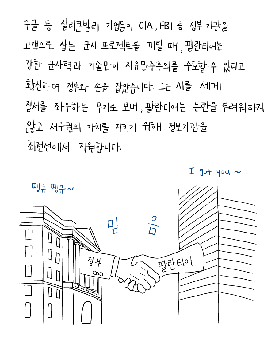 구글 등 실리콘밸리 기업들이 CIA, FBI 등 정부기관을 고객으로 삼는 군사 프로젝트를 꺼릴 때, 팔란티어는 강한 군사력과 기술만이 자유 민주주의를 수호할 수 있다고 확신하며 정부와 손을 잡았습니다.