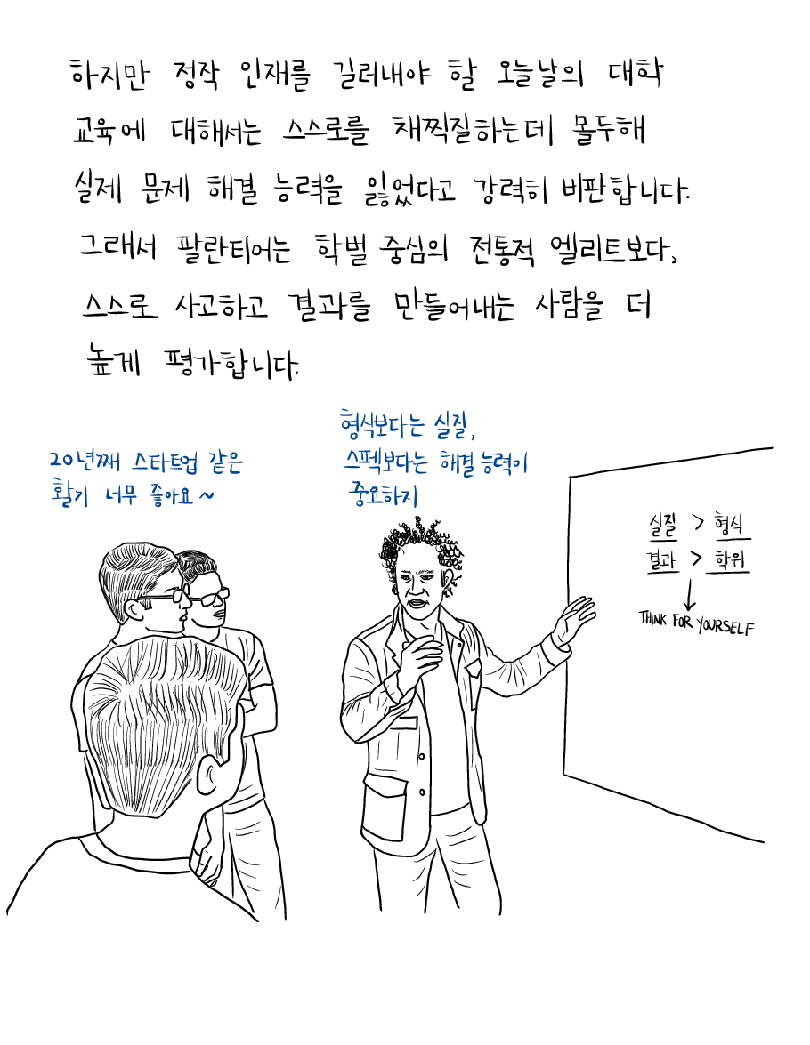 그래서 팔란티어는 학벌 중심의 전통적 엘리트보다, 스스로 사고하고 결과를 만들어내는 사람을 더 높게 평가합니다.