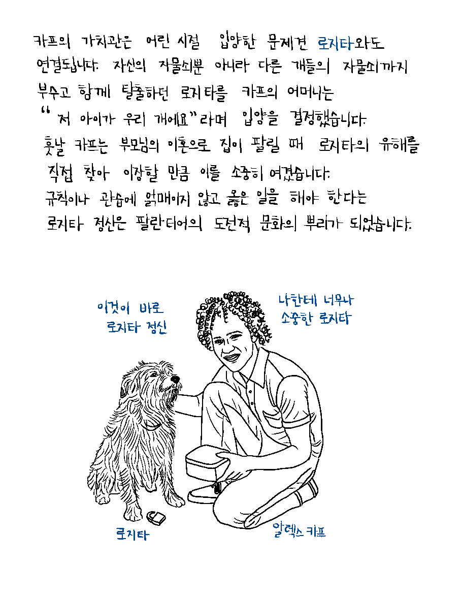 카프의 가치관은 어린 시절 입양한 문제견 로지타 Rosita와도 연결됩니다. 자신의 자물쇠뿐 아니라 다른 개들의 자물쇠까지 부수고 함께 탈출하던 로지타를 카프의 어머니는 "저 아이가 우리 개에요."라며 입양을 결정했습니다. 훗날 카프는 부모님의 이혼으로 집이 팔릴 때 로지타의 유해를 직접 찾아 이장할 만큼 이를 소중히 여겼습니다.