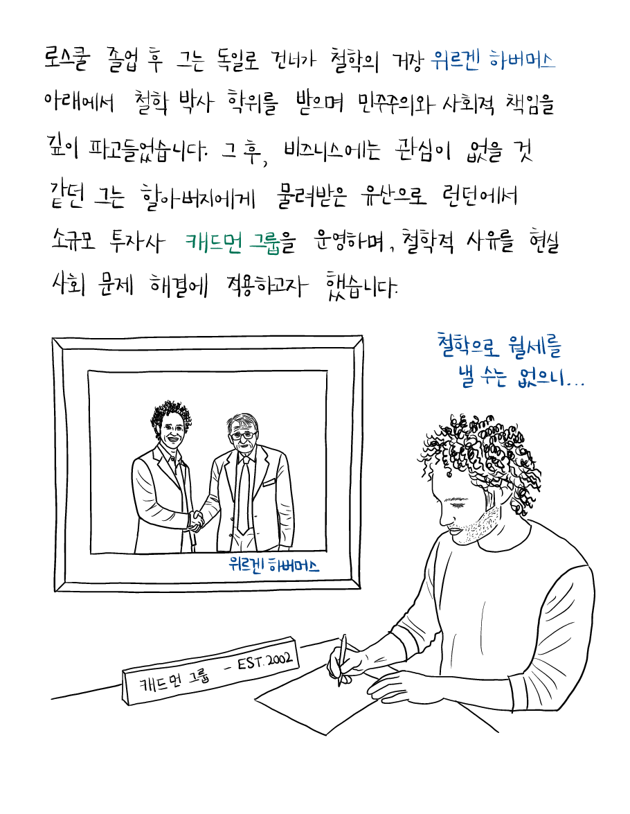 로스쿨 졸업 후 그는 독일로 건너가 철학의 거장 위르겐 하버스 Jürgen Habermas 아래에서 철학박사 학위를 받으며, 민주주의와 사회적 책임을 깊이 파고 들었습니다. 그 후, 비즈니스에는 관심이 없을 것 같던 그는 할아버지에게 물려받은 유산으로 런던에서 소규모 투자사 캐드먼 그룹 The Cadman Group을 운영하며, 철학적 사유를 현실 사회 문제 해결에 적용하고자 했습니다.