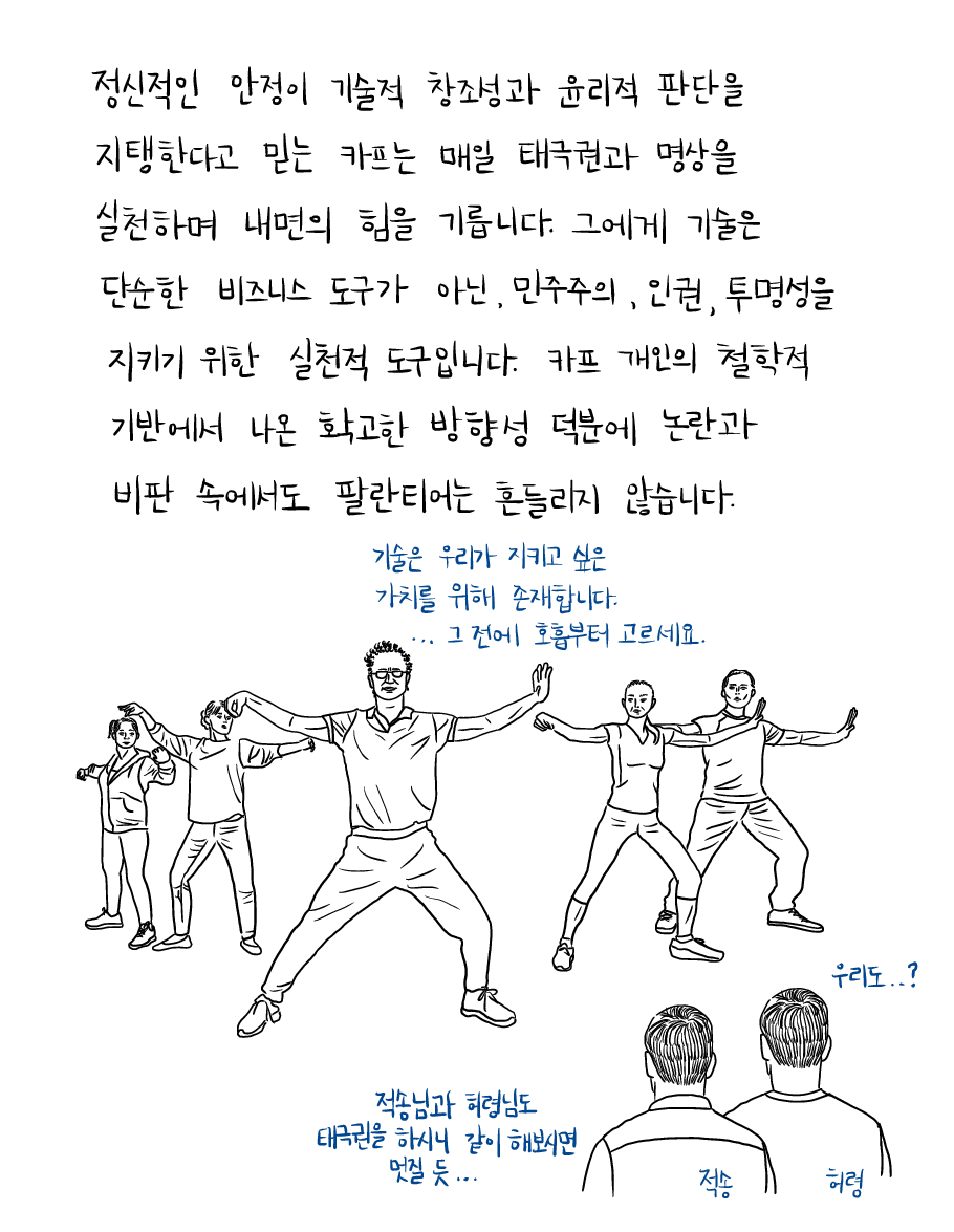 정신적인 안정이 기술적 창조성과 윤리적 판단을 지탱한다고 믿는 카프는 매일 태극권과 명상을 실천하며 내면의 힘을 기릅니다. 그에게 기술은 단순한 비즈니스 도구가 아닌, 민주주의, 인권, 투명성을 지키기 위한 실천적 도구입니다. 카프 개인의 철학적 기반에서 나온 확고한 방향성 덕분에 논란과 비판 속에서도 팔란티어는 흔들리지 않습니다.