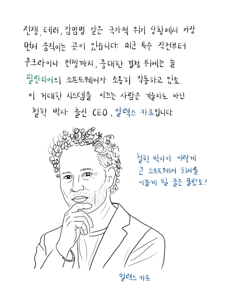 전쟁, 테러, 감염병 같은 국가적 위기 상황에서 가장 먼저 움직이는 곳이 있습니다. 미군 특수 작전부터 우크라이너 전쟁까지, 중대한 결정 뒤에는 늘 팔란티어 Palantir의 소프트웨어가 조용히 작동하고 있죠. 이 거대한 시스템을 이끄는 사람은 바로 기술자도 아닌 철학박사 출신 CEO, 알렉스 카프 Alex Karp입니다.