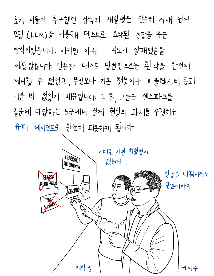초기 이들이 추구했던 검색의 재발명은 단순히 거대 언어 모델(LLM)을 이용해 텍스트로 요약된 정답을 주는 방식이었습니다. 하지만 이내 그 시도가 실패였음을 깨달았습니다. 단순히 텍스트 답변만으로는 환각을 완전히 제어할 수 없었고, 무엇보다 기존 챗봇이나 퍼플렉시티 Perplexity 등과 다를 바 없었기 때문입니다. 그 후, 그들은 젠스파크 Zenspark 를 질문에 대답하는 도구에서 실제 현실의 과제를 수행하는 슈퍼 에이전트 Super Agent 로 완전히 피봇 Pivot하게 됩니다.