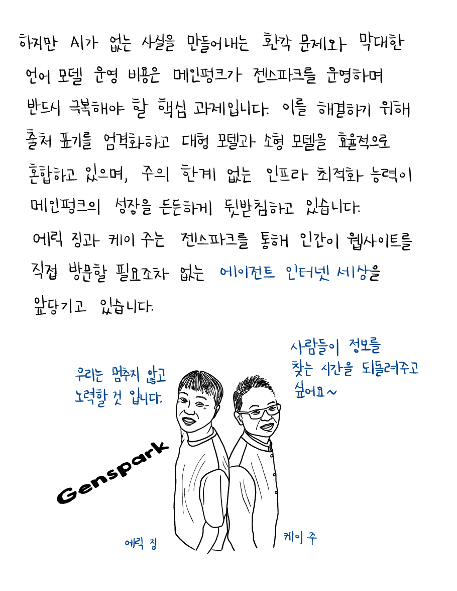 하지만 AI가 없는 사실을 만들어내는 환각 문제와 막대한 언어 모델 운영 비용은 메인펑크가 젠스파크를 운영하며 반드시 극복해야 할 핵심과제입니다. 이를 해결하기 위해 출처 표기를 엄격화하고 대형모델과 소형모델을 효율적으로 혼합하고 있으며, 주의 한계없는 인프라 최적화 능력이 메인펑크의 성장을 든든하게 뒷받침하고 있습니다.