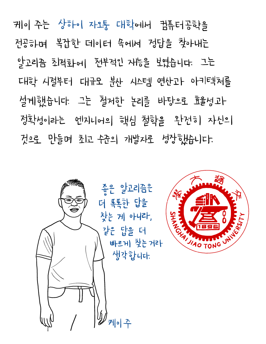 캐이 주는 상하이 자오퉁 대학 上海交通大學敎 Shanghai Jiaotong University 에서 컴퓨터공학을 전공하며 복잡한 데이터 속에서 정답을 찾아내는 알고리즘 최적화에 천부적인 재능을 보였습니다. 그는 대학 시절부터 대규모 분산 시스템 연산과 아키텍처를 설계했습니다. 그는 철저한 논리를 바탕으로 효율성과 정확성이라는 엔지니어의 핵심 철학을 완전히 자신의 것으로 만들며 최고 수준의 개발자로 성장했습니다.