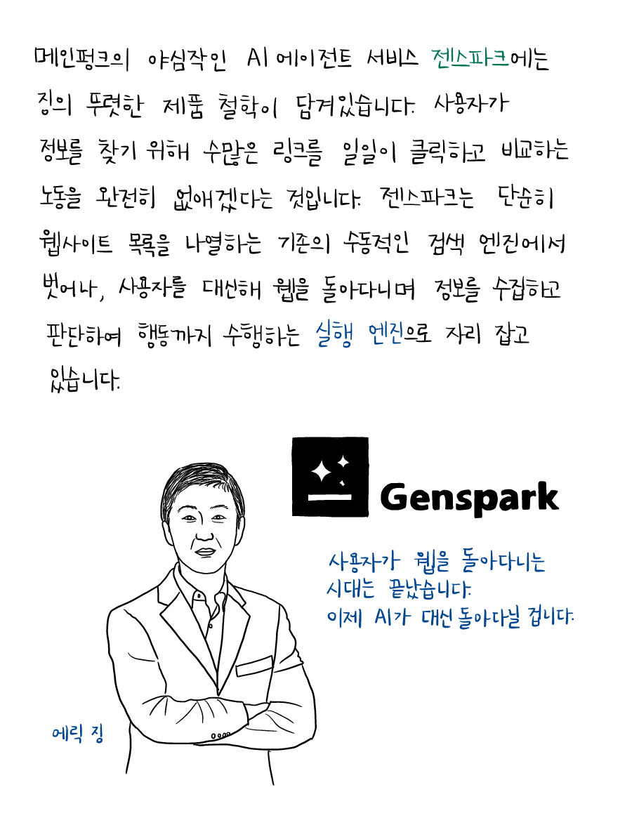 메인펑크의 야심작인 AI 에이전트 서비스 젠스파크 Zenspark 에는 징의 뚜렷한 제품 철학이 담겨 있습니다. 사용자가 정보를 찾기 위해 수많은 링크를 일일이 클릭하고 비교하는 노동을 완전히 없애겠다는 것입니다. 젠스파크는 단순히 웹사이트 목록을 나열하는 기존의 수동적인 검색 엔진에서 벗어나, 사용자를 대신해 웹을 돌아다니며 정보를 수집하고 판단하여 행동까지 수행하는 실행 엔진으로 자리 잡고 있습니다.