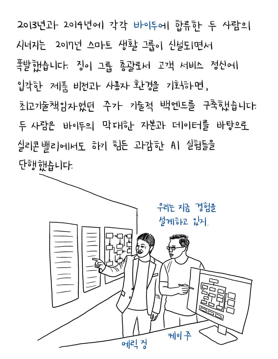 2013년과 2014년에 각각 바이두 百度 Baidu 에 합류한 두 사람의 시너지는 2017년 스마트 생활 그룹이 신설되면서 폭발했습니다. 징이 그룹 총괄로서 고객서비스 정신에 입각한 제품 비전과 사용자 환경 Frontend을 기획하면, 최고기술책임자였던 주가 기술적 백엔드 Backend를 구축했습니다. 두 사람은 바이두의 막대한 자본과 데이터를 바탕으로 실리콘밸리에서도 하기 힘든 과감한 AI 실험들을 단행했습니다.