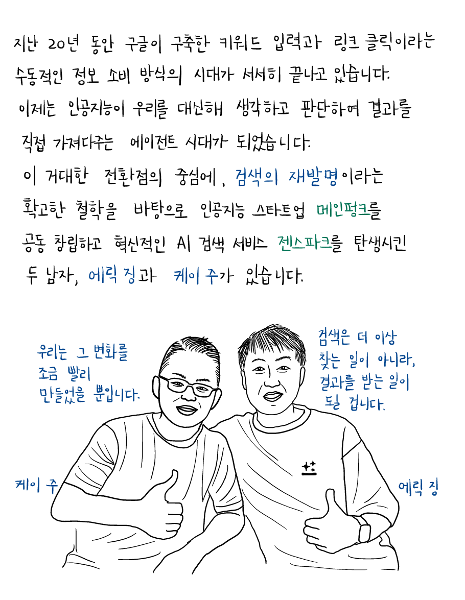 이 거대한 전환점의 중심에, 검색의 재발명이라는 확고한 철학을 바탕으로 인공지능 스타트업 메인펑크 Mainfunc Inc. 를 공동 창업하고, 혁신적인 AI 검색 서비스 젠스파크 Genspark 를 탄생시킨 두 남자, 에릭 징 Eric Jing 과 케이 주 Kay Zhu 가 있습니다.