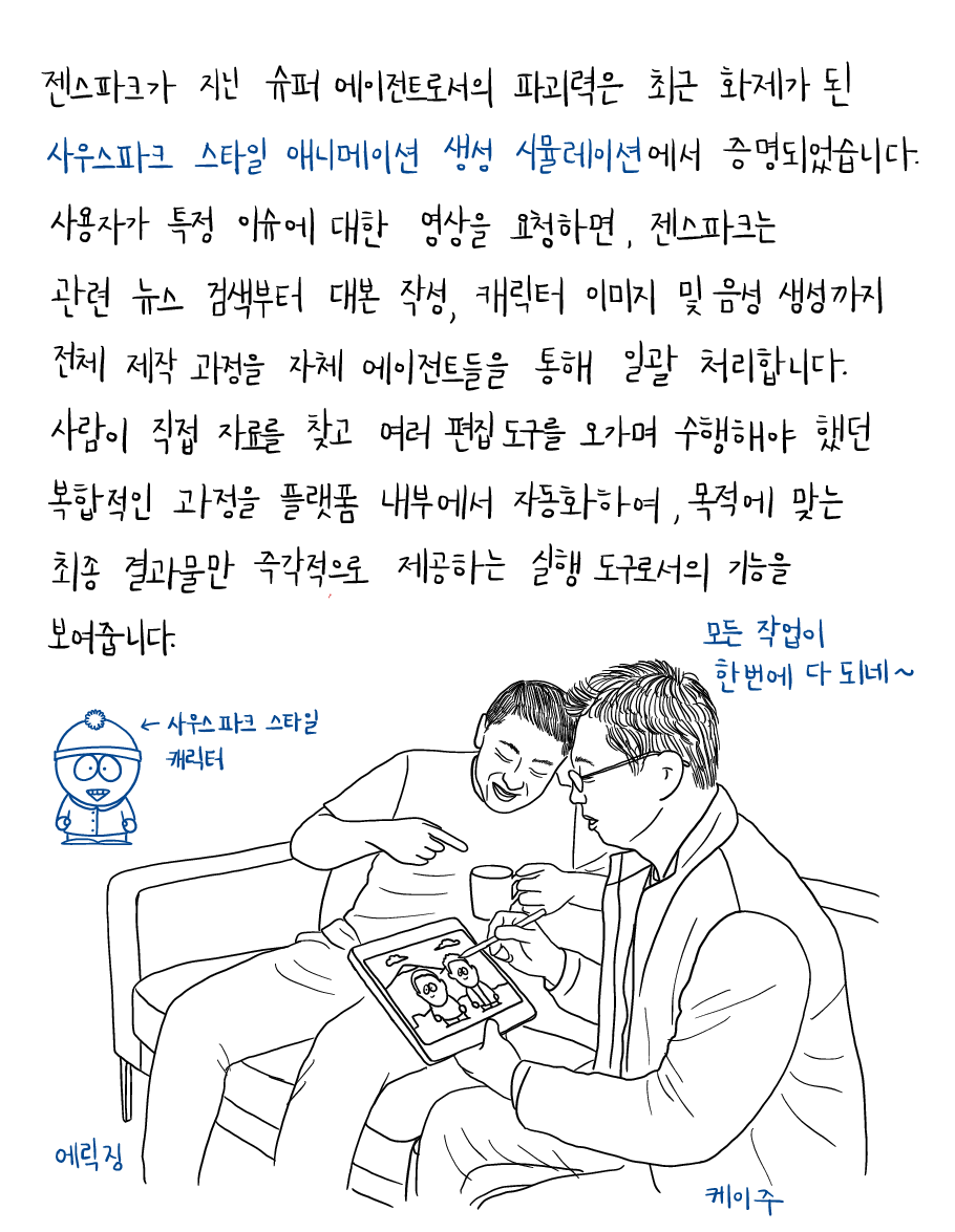 젠스파크가 지닌 슈퍼 에이전트로서의 파괴력은 최근 화제가 된 사우스파크 스타일 애니메이션 South Park Style Animation 생성 시뮬레이션에서 증명되었습니다. 사용자가 특정 이슈에 대한 영상을 요청하면, 젠스파크는 관련 뉴스 검색부터 대본 작성, 캐릭터 이미지 및 음성 생성까지 전체 제작과정을 자체 에이전트들을 통해 일괄 처리합니다. 사람이 직접 자료를 찾고 여러 편집도구를 오가며 수행해야 했던 복합적인 과정을 플랫폼 내부에서 자동화하며, 목적에 맞는 최종 결과물만 즉각적으로 제공하는 실행 도구로서의 기능을 보여줍니다.