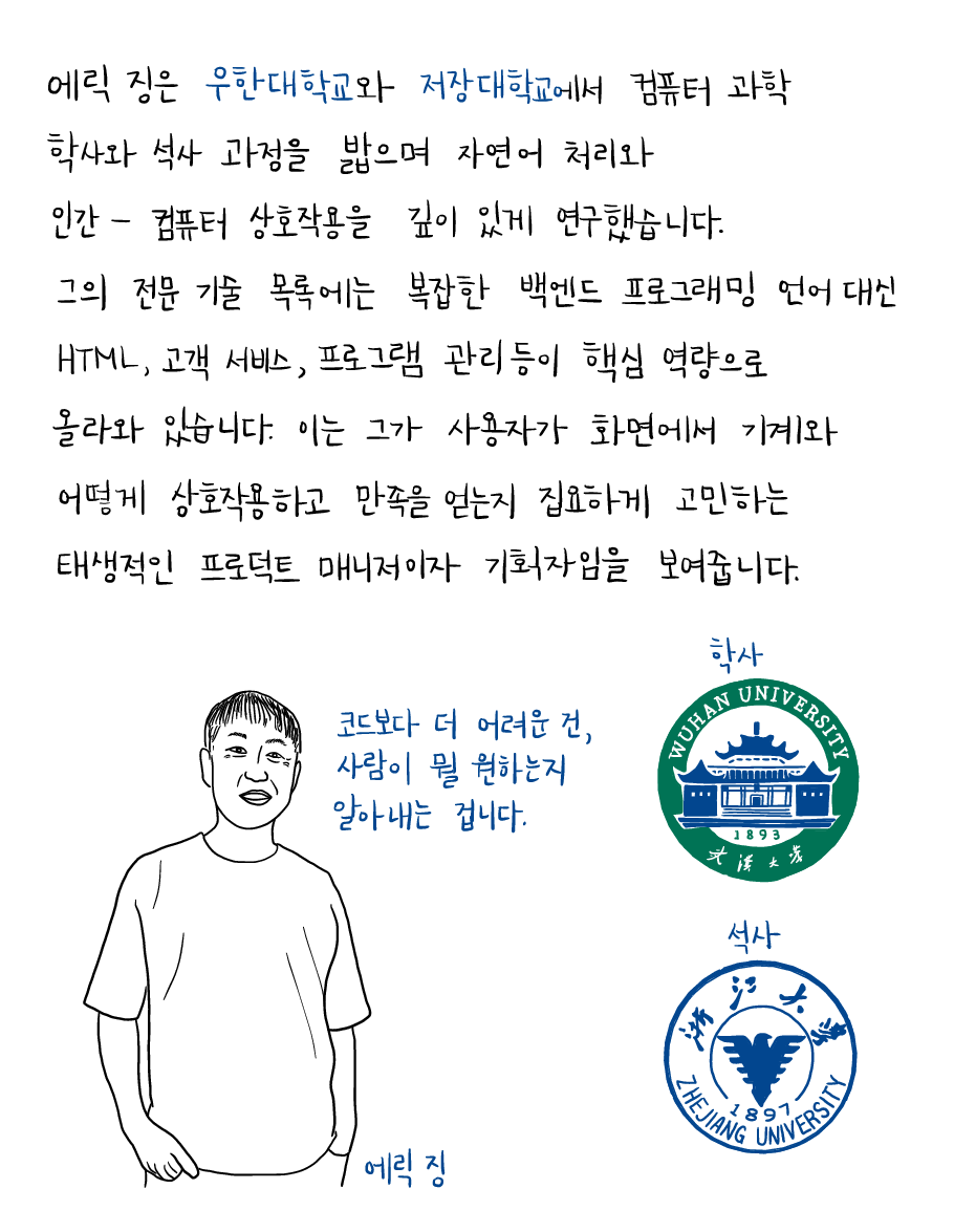 에릭 징은 우한대학교 武漢大學敎 Wuhan University 와 저장대학교 浙江大學敎 Zhejiang University 에서 컴퓨터과학 학사와 석사과정을 밟으며 자연어 처리와 인간-컴퓨터 상호작용을 깊이 있게 연구했습니다. 그의 전문 기술 목록에는 복잡한 백엔드 프로그래밍 언어 Backend Programming Language 대신 HTML, 고객 서비스, 프로그램 관리 등이 핵심역량으로 올라와 있습니다. 이는 그가 사용자가 화면에서 기계와 어떻게 상호작용하고 만족을 얻는지 집요하게 고민하는 태생적인 프로덕트 매니저 Product Manager 이자 기획자임을 보여줍니다.