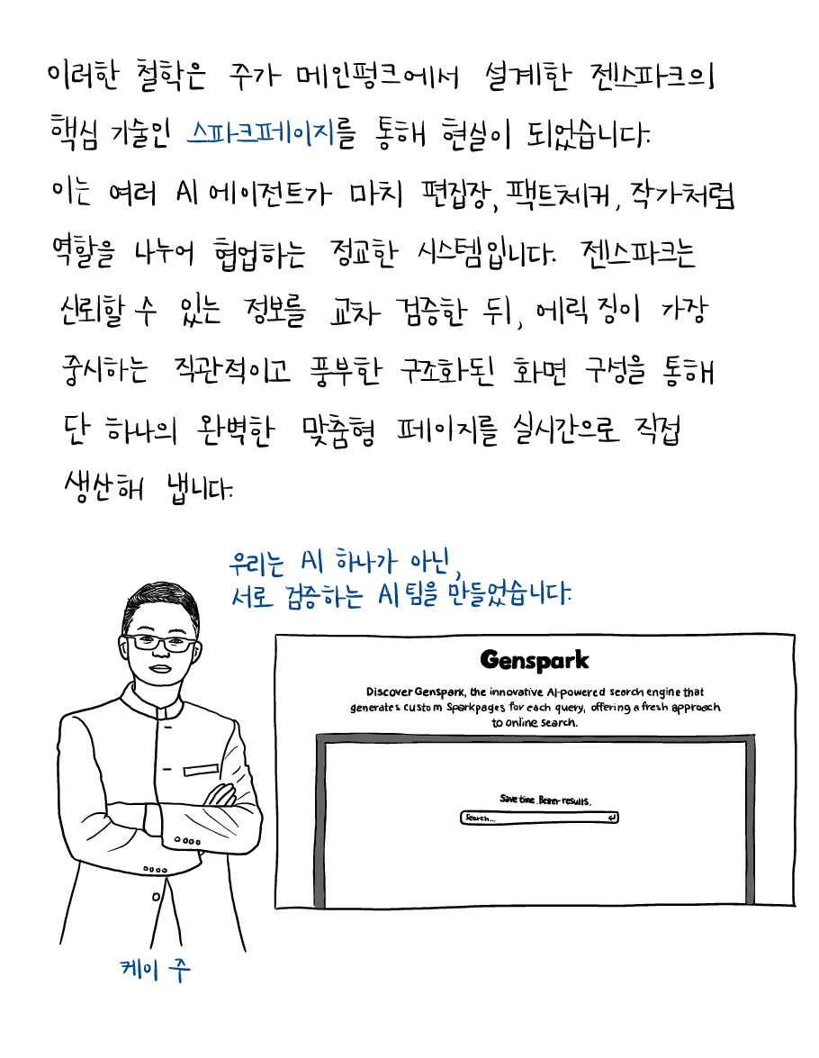 이러한 철학은 주가 메인펑크에서 설계한 젠스파크의 핵심 기술인 스파크페이지 SparkPage 를 통해 현실이 되었습니다. 이는 여러 AI 에이전트가 마치 편집장, 팩트체커 Fact Checker, 작가처럼 역할을 나누어 협업하는 정교한 시스템입니다. 젠스파크는 신뢰할 수 있는 정보를 교차 검증한 뒤, 에릭 징이 가장 중시하는 직관적이고 풍부한 구조화된 화면 구성을 통해 단 하나의 완벽한 맞춤형 페이지를 실시간으로 직접 생산해냅니다.