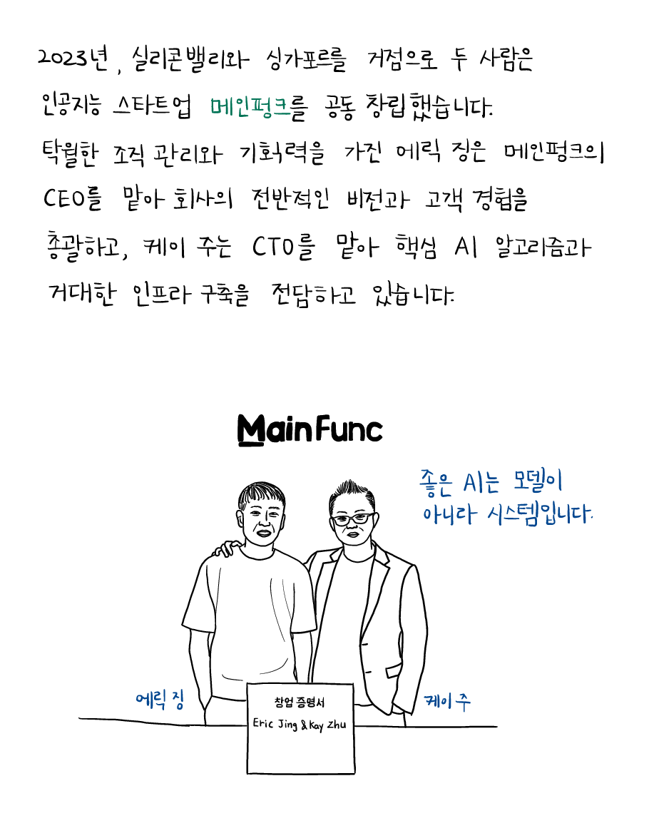 2023년, 실리콘밸리와 싱가포르를 거점으로 두 사람은 인공지능 스타트업 메인펑크 Mainfunc Inc. 를 공동 창업했습니다. 탁월한 조직관리와 기획력을 가진 에릭 징은 메인펑크의 CEO를 맡아 회사의 전반적인 비전과 고객 경험을 총괄하고, 케이 주는 CTO를 맡아 핵심 AI 알고리즘과 거대한 인프라 구축을 전담하고 있습니다.
